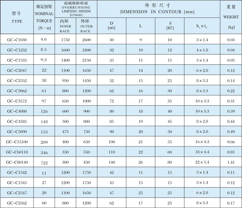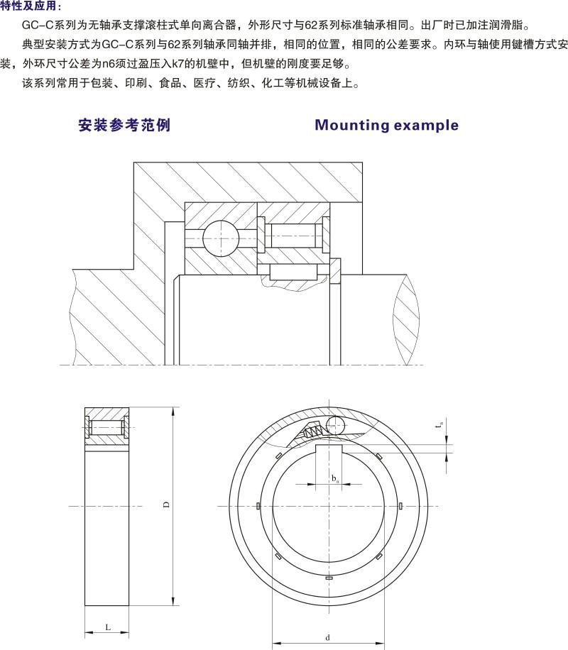產品描述:GC-C系列為無軸承支撐滾柱式單向聯軸器,外形尺寸與62系列標準軸承相同。