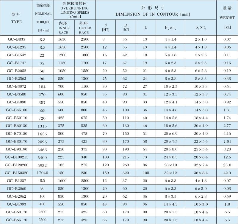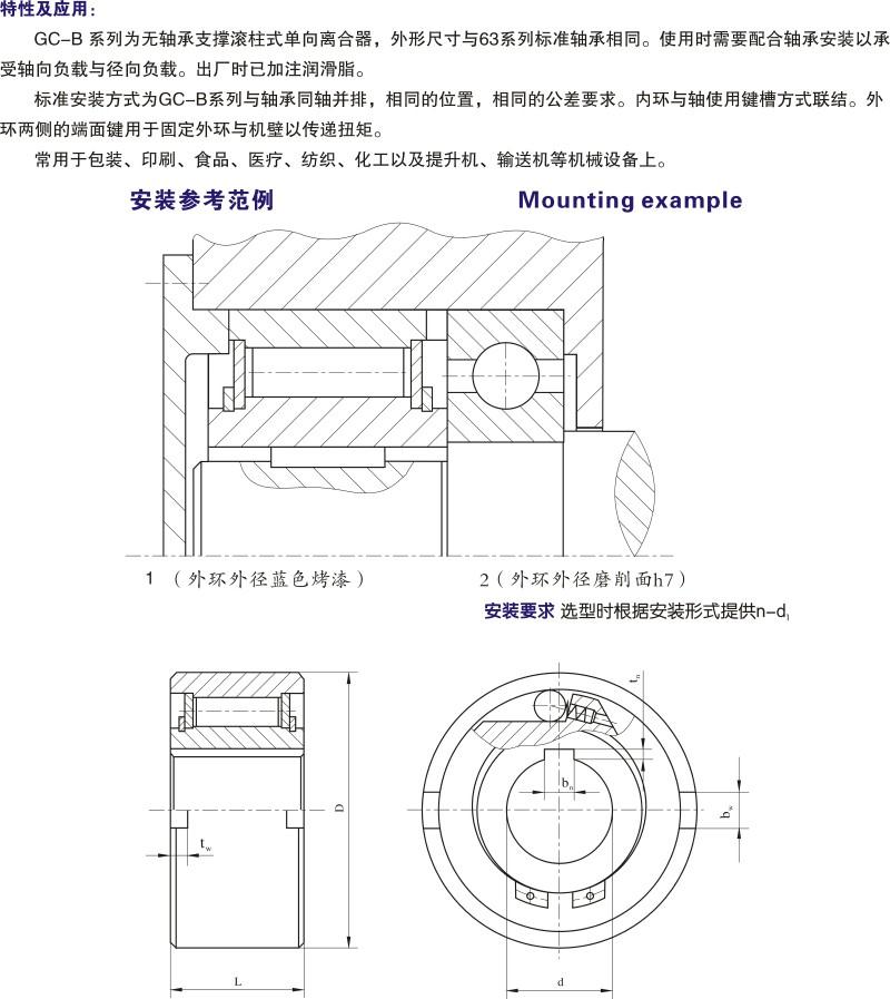 產品描述:GC-B系列為無軸承支撐滾柱式單向離合器,外形尺寸與63系列標準軸承相同。