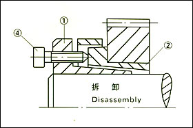 2、拆卸:拆卸時先將全部螺栓放松幾圈。然后在拆卸的螺孔內交叉地擰入螺栓④頂松脹套。
